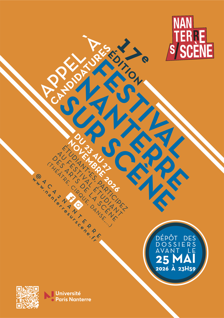 Le Festival se déroulera cette année du 23 au 27 novembre 2026. Les spectacles seront présentés au Théâtre Koltès et à l’Espace Reverdy de l’Université Paris Nanterre. À l’issue de la compétition, le jury professionnel remettra le Grand prix Nanterre sur Scène : une dotation de 2 500 € ; le jury lycéen remettra le Prix des lycéen·nes : une dotation de 700 € ; et le jury d’étudiant·es, enseignant·es et personnels remettra le Prix de la communauté UPN : une dotation de 700 €. Une résidence artistique de 5 jours dans l'un de nos espaces complète l’obtention de chaque prix. Nous vous remercions par avance de diffuser cet appel à participation, et restons à votre disposition pour toutes informations complémentaires dont vous pourriez avoir besoin.